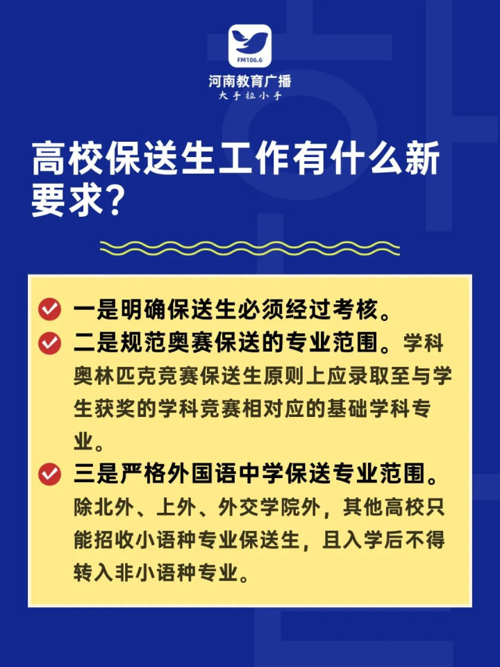 一是明确保送生必须经过考核。要求有关高校根据办学定位及相关专业人才培养需要,严格制定保送生考试工作方案,精心设置保送生考核内容及录取标准,不得简单以提交材料审核代替线下考核。