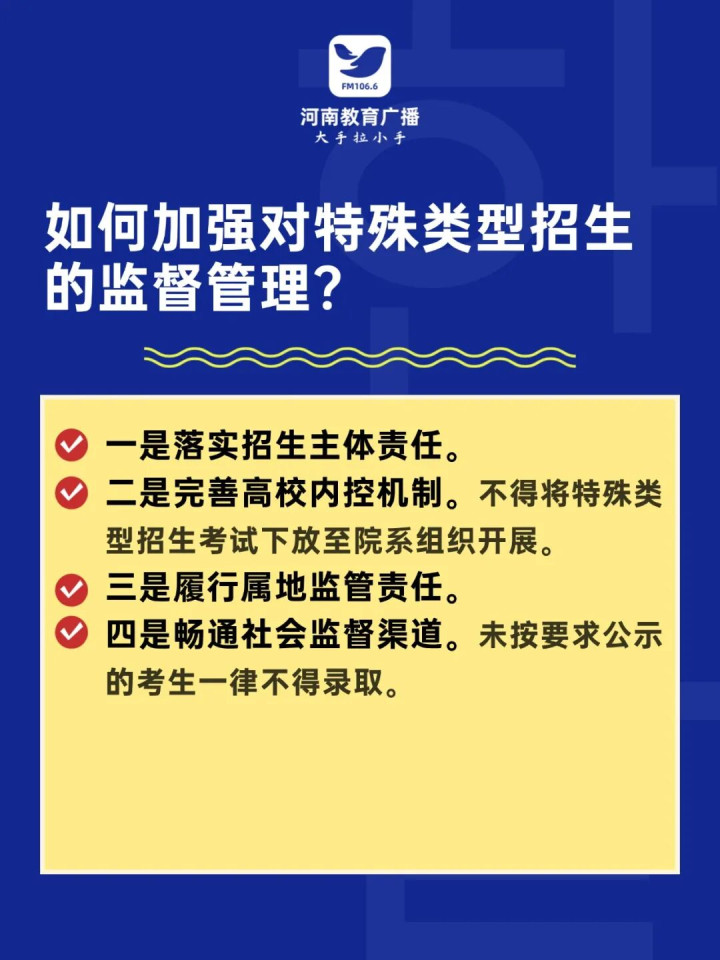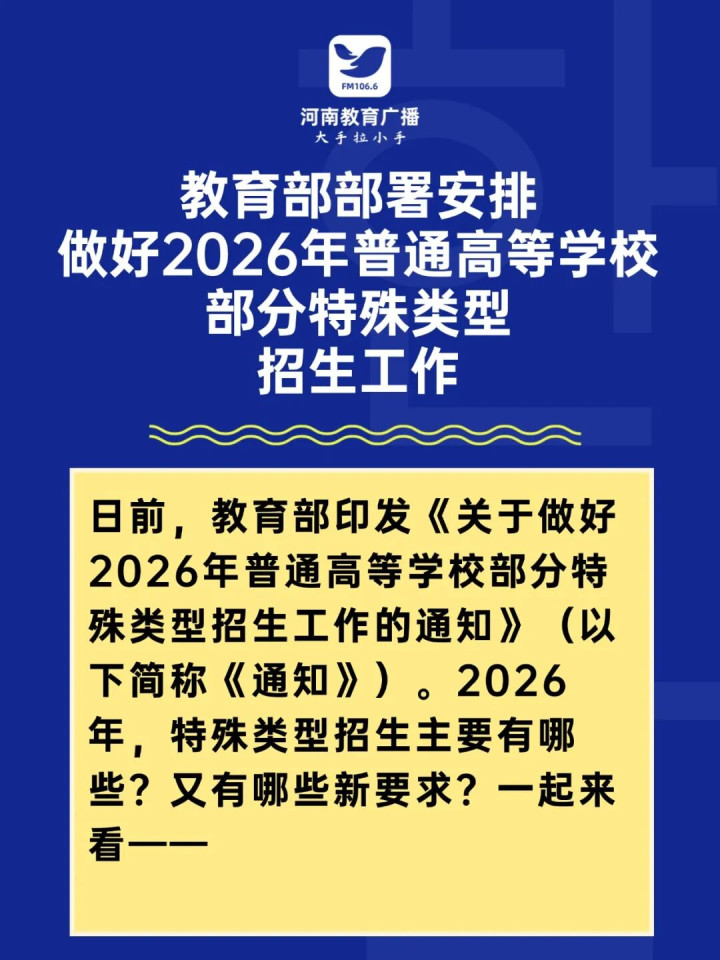 11月3日日,教育部印发《关于做好2026年普通高等学校部分特殊类型招生工作的通知》(以下简称《通知》)。2026年特殊类型招生有哪些新变化?又有哪些新要求?跟教育广播一起来看——