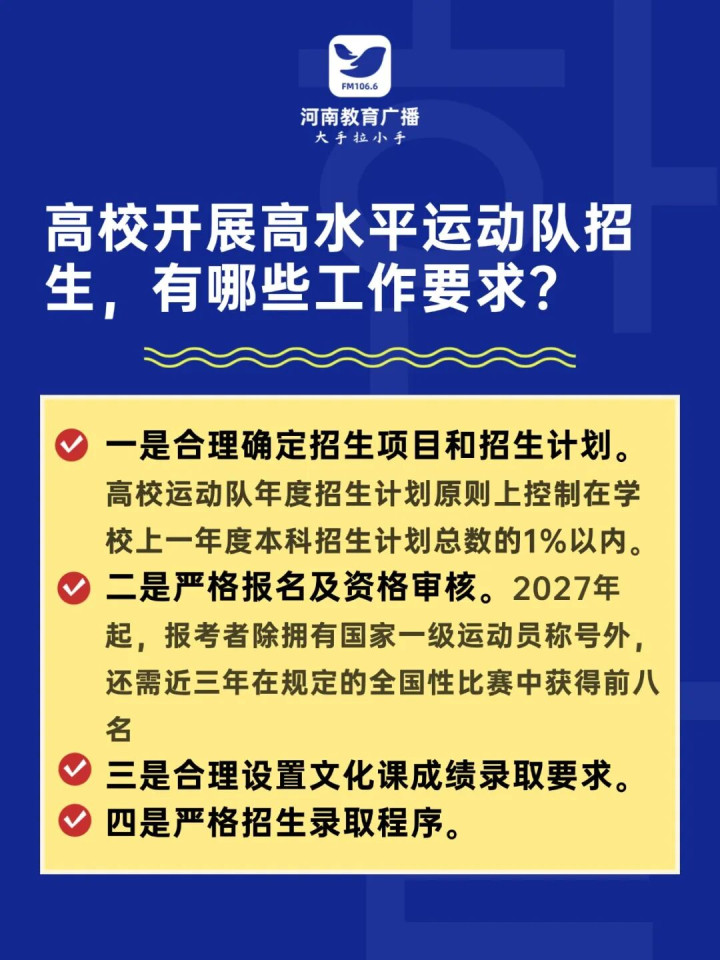 二是严格报名及资格审核。2026年,符合生源省份高考报名条件,获得国家一级运动员(含)以上技术等级称号者可报考相关高校高水平运动队招生。2027年起,获得国家一级运动员(含)以上技术等级称号且近三年在体育总局、教育部规定的全国性比赛中获得前八名者方可报考。高校要加强考生报考资格审核,重点加强对考生运动员技术等级证书的核验。