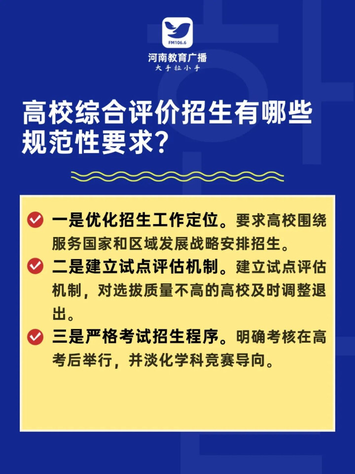 一是优化招生工作定位。要求高校围绕服务国家和区域发展战略,安排相关急需紧缺专业以及高校优势特色发展的“冷门绝学”、一流学科专业开展招生。相关省级教育行政部门要对属地内试点高校综合评价招生专业进行审核备案。