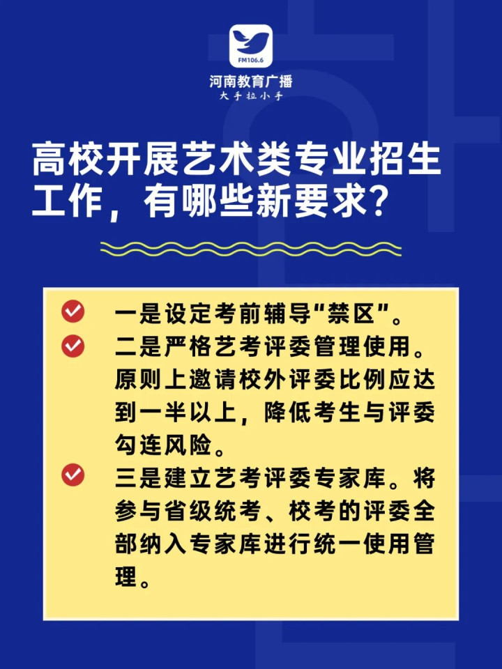 三是建立艺考评委专家库。将参与省级统考、校考的评委全部纳入专家库进行统一使用管理。一旦发现评委存在可能影响考试招生公平公正行为,坚决严肃查处并纳入“黑名单”,相关人员不得再承担艺术类专业省级统考、校考评委工作。